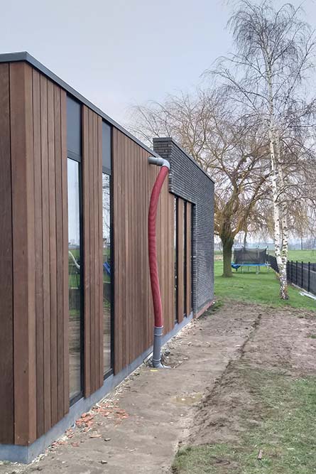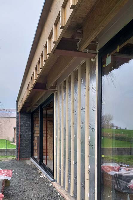 Le bardage a été posé (il va grisonner) et la pose des châssis est en cours !