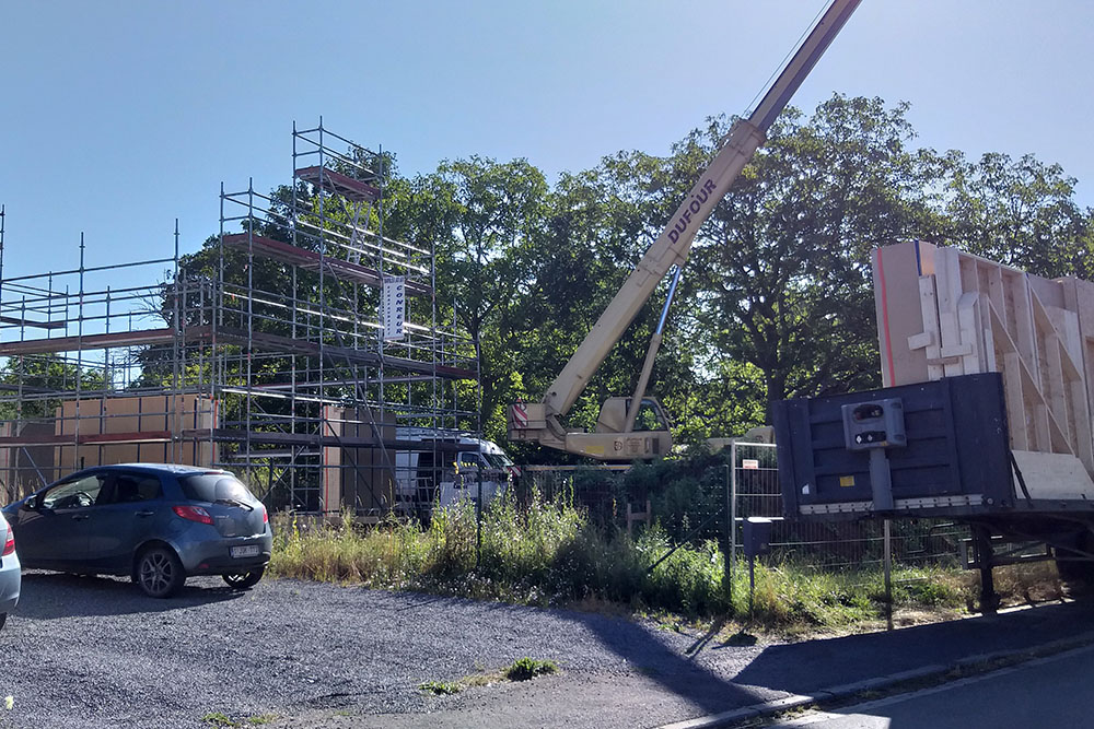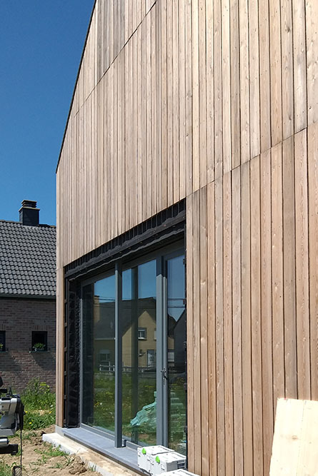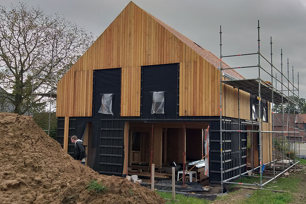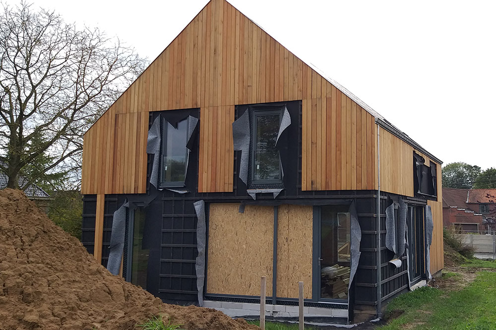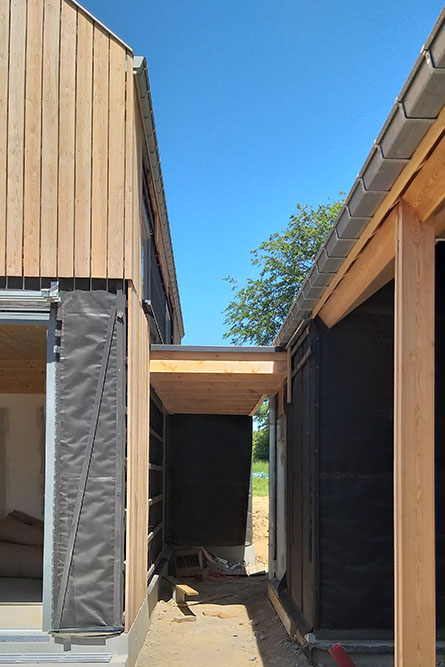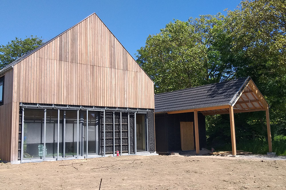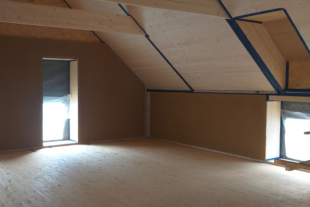 Pour répondre à cette « étiquette », les murs et toitures sont en ossature bois avec une isolation en paille de 46cm. Un enduit d’argile couvre les murs pour les faces intérieures et un complexe de bardage bois habille les faces extérieures.